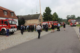 Gäste und Feuerwehrabordnungen mit unterschidlichen letzte Festlegungen und dann beginnt die Fahrzeugen sowie die Blaskapelle treffen ein. Aufstellung aller Beteiligten
